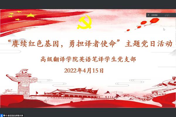 为推动“迎盛会、铸忠诚、强担当、创业绩”主题学习宣传教育实践活动扎实开展,深入学习贯彻党的十九届六中全会精神,落实习近平总书记关于推进国际传播能力建设的重要讲话精神,4月15日下午,高级翻译学院英语笔译学生党支部开展“赓续红色基因,勇担译者使命”线上主题党日活动。校党委书记殷奇出席,学院党委书记韩芳、副书记史宁以及支部全体党员参加了活动。殷奇指出,高级翻译学院在中央文献翻译和天津市疫情防控新闻发布翻译中屡立新功,是天津外国语大学的一张靓丽名片。他强调,习近平总书记在中共中央政治局第三十次集体学习时的重要讲话是对我国国际传播事业作出的新擘画、新论断,也是对继续推进国际传播能力建设提出的新要求。加强国际传播能力建设,构建中国的国际话语权,翻译人才培养是核心。提高翻译人才培养质量,是学院“为党育人,为国育才”的使命。他指出,学院未来要以问题为导向,在巩固翻译成果的同时,在扩大翻译研究上下功夫,不仅要做好翻译实践,更要做好翻译研究。他鼓励学生党员既要苦练过硬本领,夯实专业能力,也要涵养高尚品德、深厚中华文化功底,更要提高理论素养、坚定理想信念。活动中,支部联系人、专业教师华云鹏结合笔译翻译实际