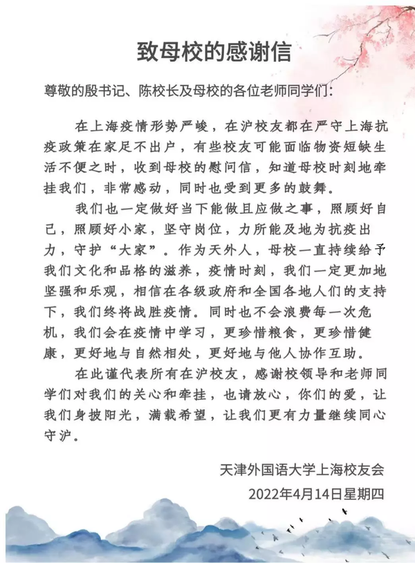 当美丽的申城面临着严峻的疫情考验,每一位身在上海的天外人都牵动着母校的心,虽时空相隔,却心心相印。4月11日,学校向上海校友致信,对他们及家人表示诚挚问候,凝聚天外人齐心战疫的强大信心,并做好天外人战胜疫情的坚强后盾。4月14日,上海校友会向母校回信,感谢来自母校的慰问和支持。致母校冬去春来,母校与每一位天外人始终心手相依,守望相助,我们众志成城,必将战胜疫情,期待共赴天外之约,看繁花似锦,校友珍重,上海加油!