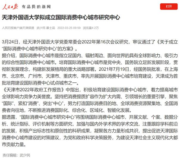 近日,人民日报客户端、新华网天津频道、学习强国APP、中国青年报客户端、《天津日报》《今晚报》《天津工人报》、网易天津等多家媒体报道我校相关工作10余篇。人民日报客户端今晚报天津教育报天津教育报头条号1天津工人报网易天津3月24日,天津外国语大学党委常委会审议通过了《关于成立“国际消费中心城市研究中心”的方案》,正式成立“国际消费中心城市研究中心”,旨在通过开展研究交流,产出科研成果,凝聚各方力量形成共识,提出促进天津国际消费中心城市建设的对策建议,为党和政府科学决策服务,为建设天津社会主义现代化大都市贡献力量。人民日报客户端、今晚报、天津教育报、天津工人报、网易天津等媒体对此进行了报道。新华网天津教育报头条号网易天津为贯彻落实习近平总书记关于国际传播能力建设的重要讲话精神,3月24日,天津外国语大学党委常委会确定计划于5月下旬举办国际传播能力建设高端论坛。新华网天津频道、天津教育报头条号、网易天津等媒体关注并报道。天津日报3月28日,《天津日报》第6版专版刊发《津城多所高校毕业生就业“年报”出炉 毕业成长季 一起向未来》一文,聚焦“就业”这一社会热点话题,对天津市10多所不同类型高