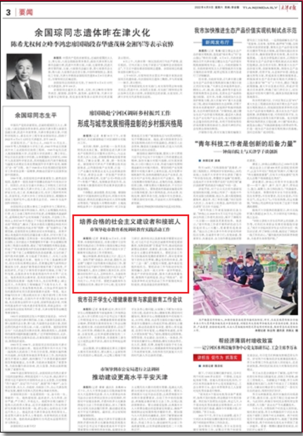 天津日报4月8日,市委常委、市委组织部部长、市委主题学习宣传教育实践活动工作领导小组组长喻云林来我校调研“迎盛会、铸忠诚、强担当、创业绩”主题学习宣传教育实践活动工作开展情况。4月9日《天津日报》以《培养合格的社会主义建设者和接班人 市领导赴市教育系统调研教育实践活动工作》为题对此进行了报道。原文转载如下:培养合格的社会主义建设者和接班人市领导赴市教育系统调研教育实践活动工作本报讯(记者 李国惠)4月8日,市委常委、市委组织部部长、市委主题学习宣传教育实践活动工作领导小组组长喻云林赴市教育系统调研,深入天津外国语大学了解教育实践活动工作开展情况。喻云林强调,教育是国之大计、党之大计。高校开展“迎盛会、铸忠诚、强担当、创业绩”主题学习宣传教育实践活动工作,要坚持用习近平新时代中国特色社会主义思想铸魂育人,落实立德树人根本任务,切实解决好培养什么人、怎样培养人、为谁培养人这个根本问题,把坚定捍卫“两个确立”内化于心、外化于形。要把忠诚教育作为首要政治任务,理论学习中心组、党支部学习研讨、教师培训以及教育教学都要突出对党、对习近平总书记的忠诚教育和爱党爱国教育,发挥思政课“主渠道”作用,推动