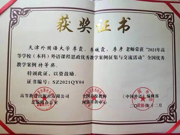 2021年12月11日,由教育部职业院校外语类专业教学指导委员会、高等教育出版社、全国高校教师网络培训中心与《中国外语》编辑部共同组织的“2021年外语课程思政优秀教学案例全国交流活动”全国总决赛成功举办。经过层层选拔,我校英语学院教师李霞老师团队(团队成员: 李霞、李媛霞、李彦) 凭借作品《信仰的力量》,以优异的表现荣获英语类专业组全国特等奖。本次活动共有来自30个省(自治区、直辖市)625所院校的3613名教师参加。作为天津市英语类专业组唯一晋级全国总决赛的教学团队,李霞老师团队围绕指定的教学单元合理进行教学设计,结合教学目标深入挖掘素材中的思政元素,将思想政治教育融入外语教学,实现了价值塑造、知识传授和能力培养等多重目标的有机融合。本次总决赛采用15分钟说课+5分钟现场问答的形式进行。在说课环节中,李霞老师以标准流利的英语对课程的教学目标、教学理论和方法、具体教学环节、现代化教学手段、学生评价体系等做了清晰系统的介绍,展现了过硬的教学能力。在现场问答环节中,面对专业评委的提问,李霞老师以大方自信的回答,展现了扎实的语言基本功和专业素养,赢得了评委们的一致好评,最终以88.62的高