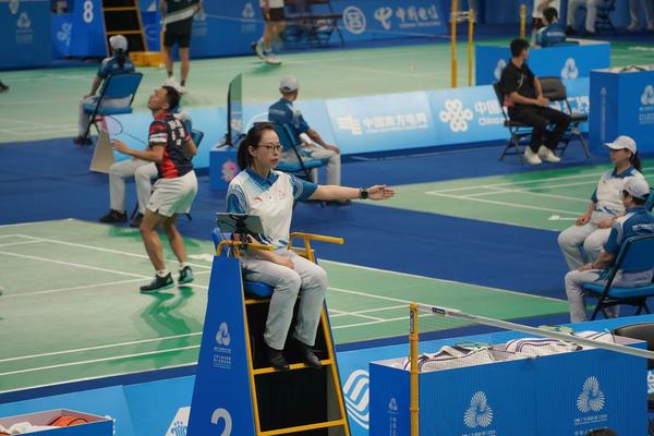 珠江之畔,圣火点燃。在激情澎湃的粤港澳大湾区,中华人民共和国第十五届运动会(以下简称全运会)激战正酣。在刚刚落下帷幕的群众比赛羽毛球项目决赛中,一抹忙碌的“天外身影”格外亮眼,她就是天津外国语大学体育部教师董媛。自2016年成为羽毛球国家级裁判员以来,董媛多次参加各项大赛,包括世界大学生运动会、亚运会、亚残运会,以及中国羽毛球公开赛等各项重大赛事。此次是董媛第二次参加全运会的群众组比赛裁判工作。在本届全运会羽毛球比赛中,董媛老师在裁判长团队的统一安排下,从一阶段小组赛一路执裁到二阶段淘汰赛和附加赛(决名次),前后共执裁20余场,每一场执裁,都展现出专业、公正、精准的专业裁判水平。从天外的讲台到
