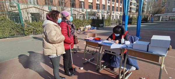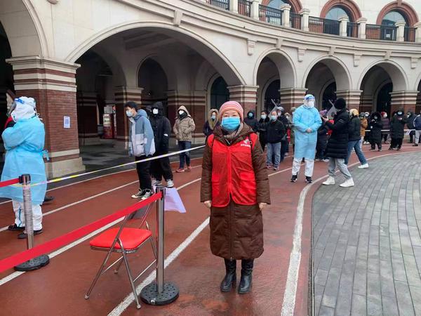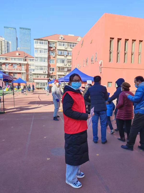 资产管理处党员干部姜婷,家住河西区庆荣里社区,12月即报名担任社区网格员,随时待命。当接到招募志愿者信息时,第一时间向社区报到,在津城“大筛”中,承担第四十一中学核酸检测点信息登记工作,在寒风中工作数个小时依然咬牙坚持,当遇到同样参加志愿服务的杜灏洁带领行动不便的老人前来检测时,她们会心一笑,这是志愿红和天外蓝的力量。