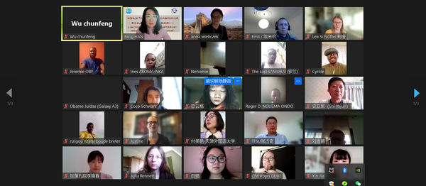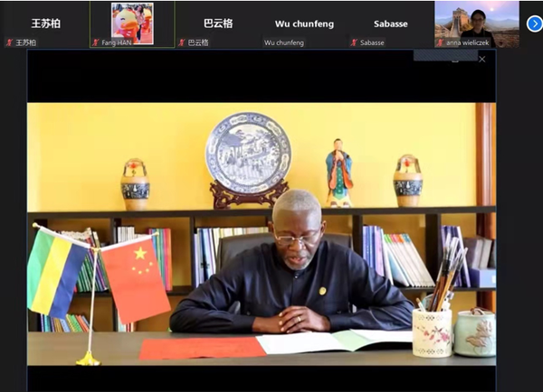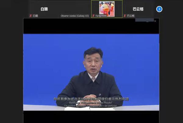 加蓬邦戈大学校长苏玛奥在致辞中简要介绍了邦戈大学孔子学院的情况。他代表邦戈大学对参加此次线上冬令营的所有师生致以诚挚问候,并在虎年新春佳节之际祝陈法春校长及天津外国语大学所有师生员工身体健康、万事如意,期待着与大家进行面对面的交流。