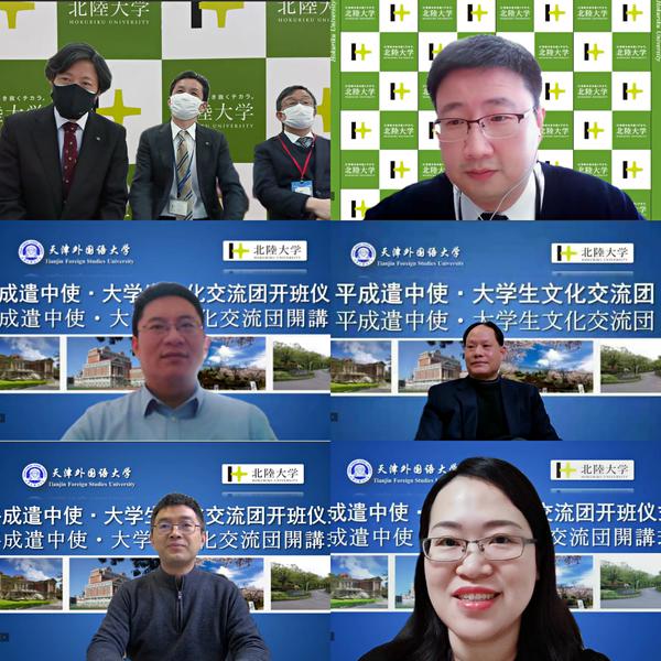 2月14日,日本北陆大学“平成遣中使·大学生文化交流团”线上中文研修项目开班仪式成功举办。北陆大学国际交流中心长胡光辉,孔子学院院长周晴,孔子学院事务局局长、国际交流中心次长中岛元春,天津外国语大学国际合作与交流处处长张占奇,日语学院党委书记尹德献、院长朱鹏霄、党委副书记刘申琦,项目授课教师,以及参与项目的日本北陆大学学生相聚“云端”。会议由日语学院专业教师袁建华主持。