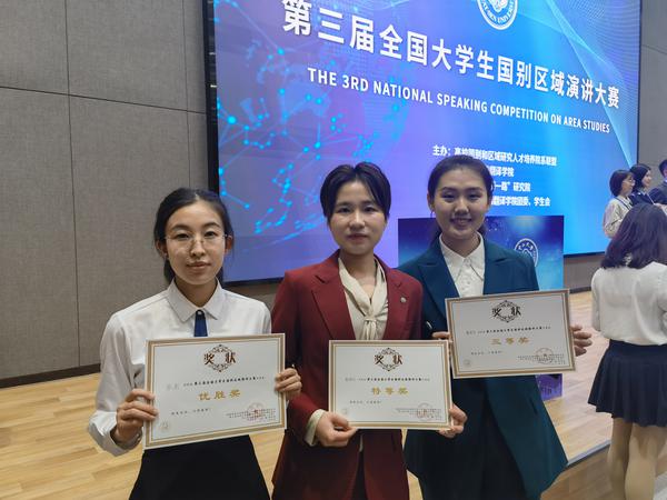 (三)举办第九届 “对外汉语桥”国际汉语教师人才选拔大赛等活动,其中彭君仪荣获第三届全国大学生国别区域演讲大赛特等奖,刘昭羽荣获全国国际中文教育教学技能大赛一等奖。