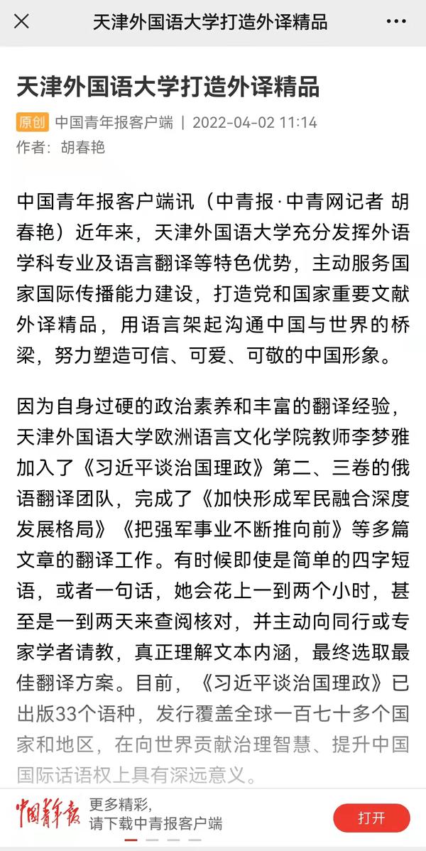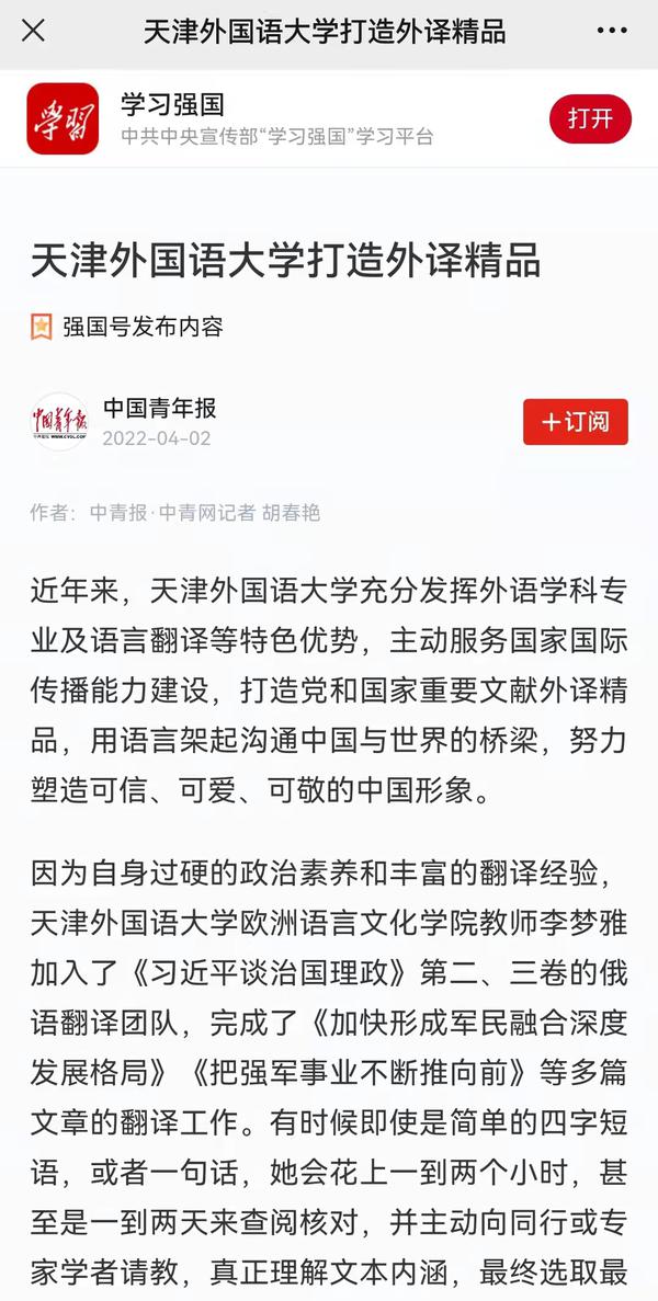 4月2日,中国青年报客户端、学习强国以《天津外国语大学打造外译精品》为题,聚焦学校充分发挥外语学科专业及语言翻译等特色优势,用语言架起沟通中国与世界的桥梁,生动展示了天外师生精“译”求精,依托“中央文献翻译研究基地”“中国特色社会主义理论体系研究中心”两大平台,先后参与和承担完成39部理论阐释和中央文献对外翻译任务,为提升新时代党的创新理论的国际影响力和辐射力、加强国际传播能力建设贡献了智慧和力量。
