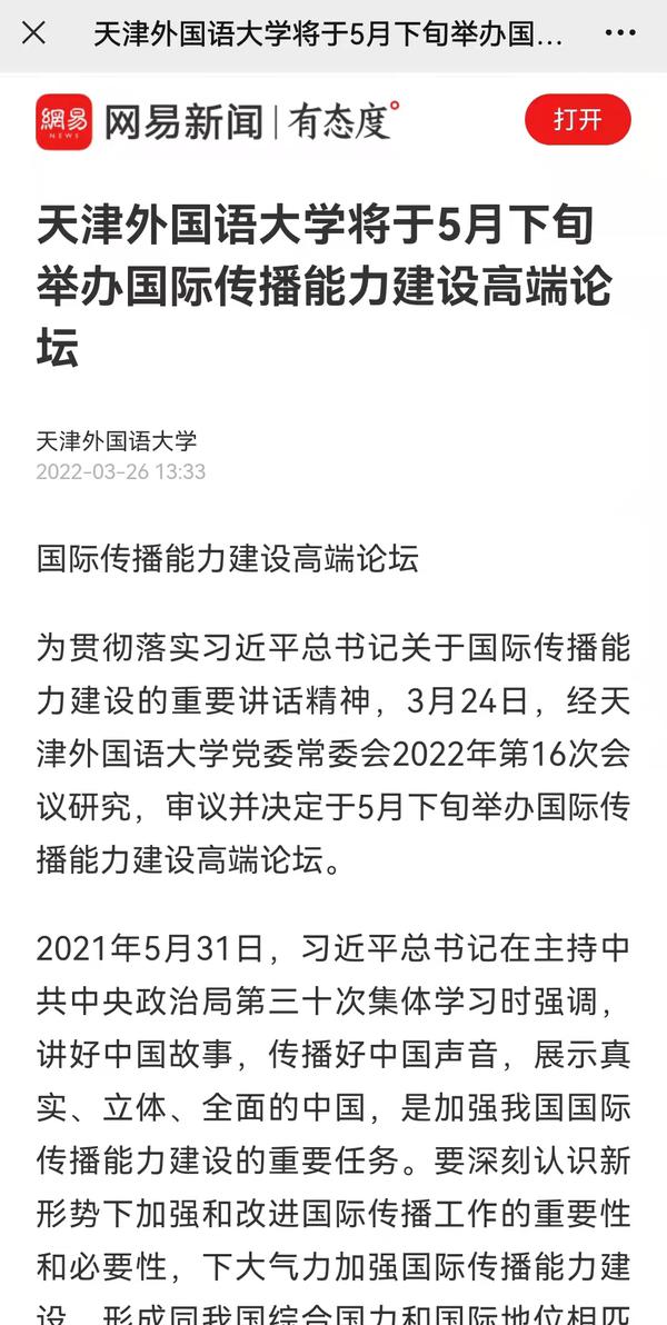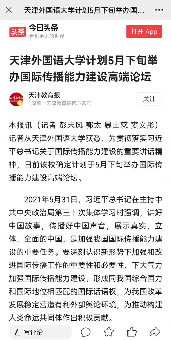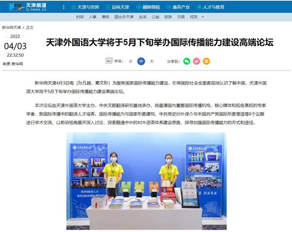 为贯彻落实习近平总书记关于国际传播能力建设的重要讲话精神,3月24日,天津外国语大学党委常委会确定计划于5月下旬举办国际传播能力建设高端论坛。新华网天津频道、天津教育报头条号、网易天津等媒体关注并报道。