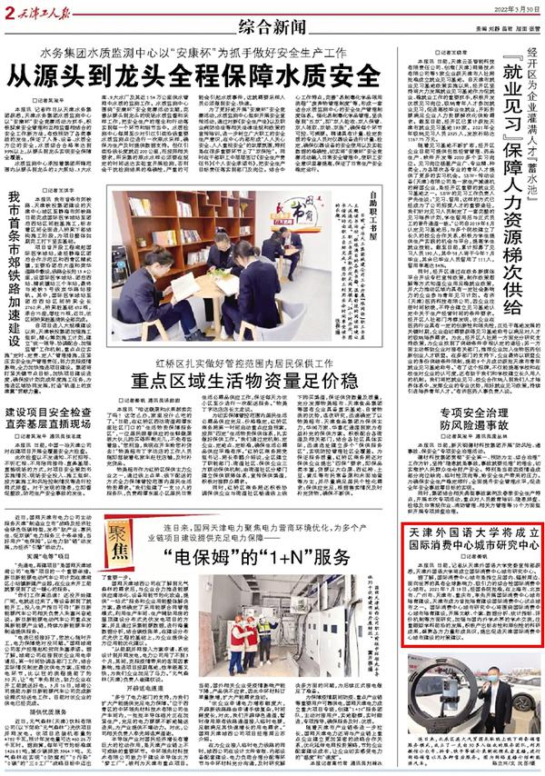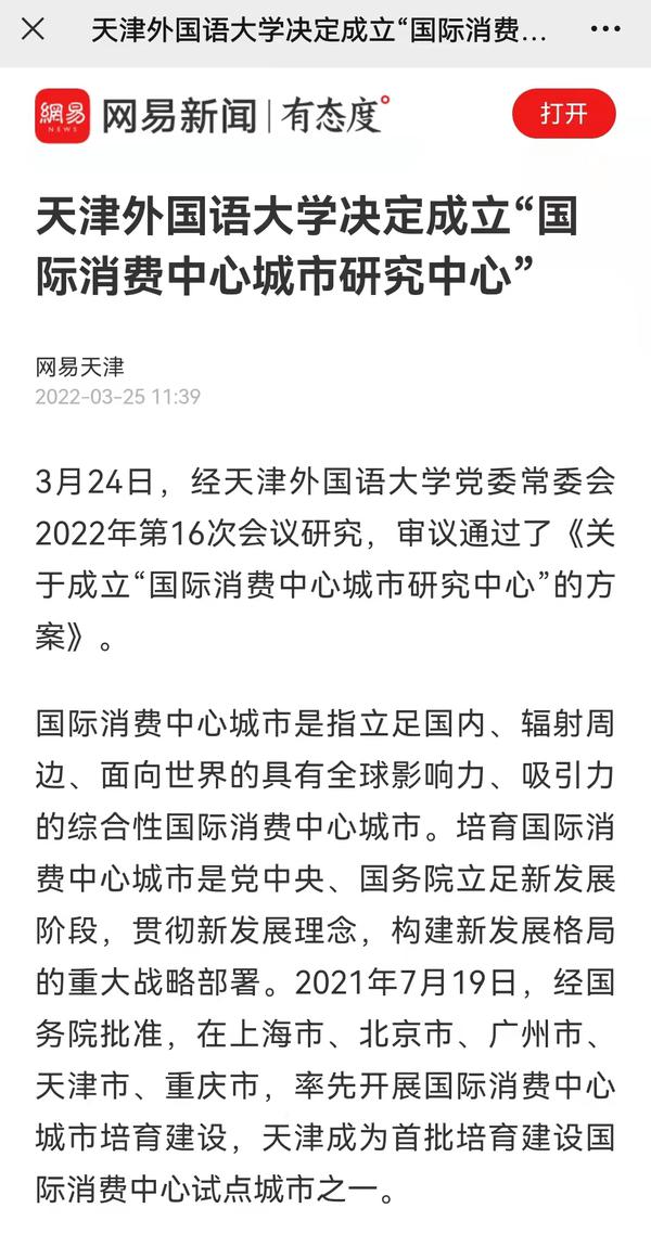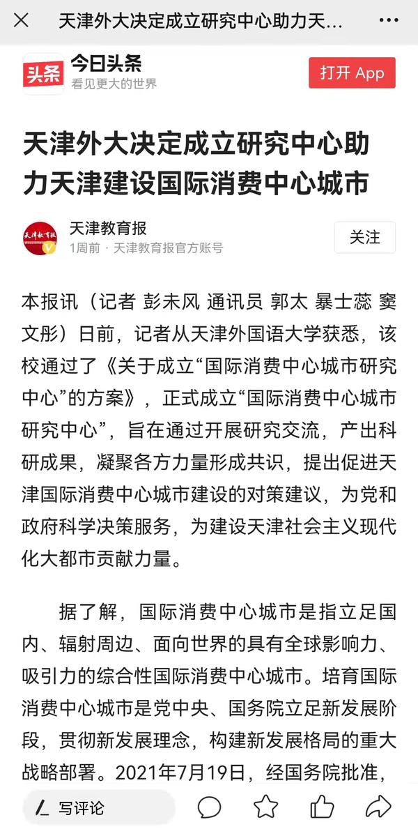 3月24日,天津外国语大学党委常委会审议通过了《关于成立“国际消费中心城市研究中心”的方案》,正式成立“国际消费中心城市研究中心”,旨在通过开展研究交流,产出科研成果,凝聚各方力量形成共识,提出促进天津国际消费中心城市建设的对策建议,为党和政府科学决策服务,为建设天津社会主义现代化大都市贡献力量。人民日报客户端、今晚报、天津教育报、天津工人报、网易天津等媒体对此进行了报道。