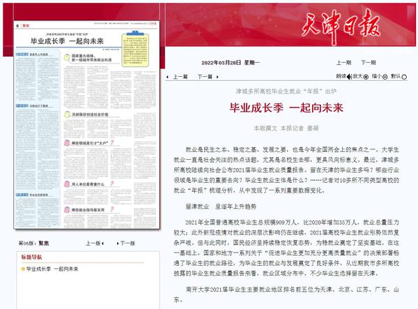 3月28日,《天津日报》第6版专版刊发《津城多所高校毕业生就业“年报”出炉 毕业成长季 一起向未来》一文,聚焦“就业”这一社会热点话题,对天津市10多所不同类型高校的就业“年报”进行梳理分析。文中指出,天津外国语大学2021届本科毕业生选择国内读研比例达11.9%,与上届基本持平,其中19%就读于一流大学建设高校、39%就读于一流学科建设高校;选择出国、出境者达8.1%,其中前往英国的人数最多。
