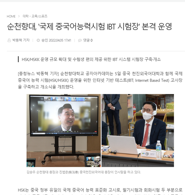 以网络考试为特色的顺天乡大学孔子学院国际汉语水平考试(HSK/HSKK)IBT(Internet Based Test)考试中心,于当地时间4月5日举行挂牌仪式。中国驻韩国大使馆教育参赞艾宏歌,韩国顺天乡大学校长金承禹,天津外国语大学校长陈法春,顺天乡大学孔子学院韩方院长朴炯春、中方院长赵华,天津外国语大学国际合作与交流处处长张占奇等相聚云端,共同为HSK考试中心揭牌。