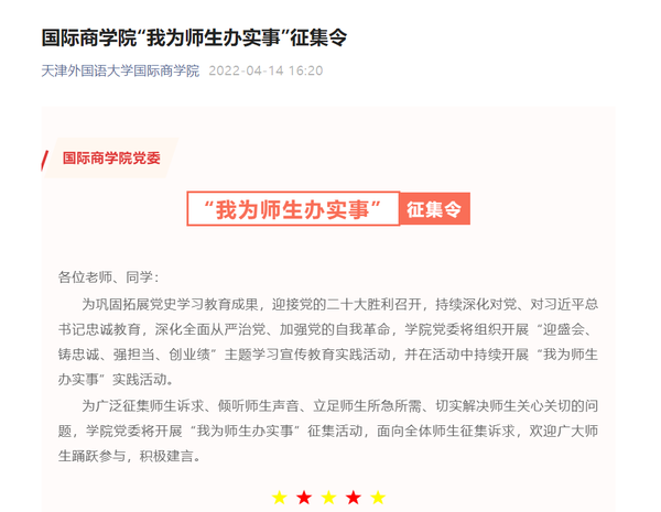 会后,学院党委将收集到的群众诉求、问题反映和意见建议归纳整理、登记造册,持续跟进,做到销账管理。2022年,国际商学院党委将通过定期开展“书记面对面”论坛、发放调查问卷、设置意见邮箱等多途径完善意见征求反馈的平台和渠道,持续务实推进“我为师生办实事”实践活动有关工作的开展,并确保事事有回音、件件有着落,以实际行动和发展实绩喜迎党的二十大胜利召开。