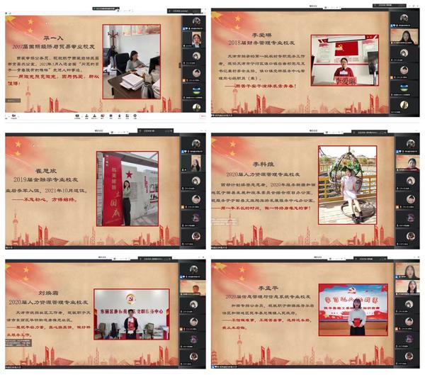 分享会中,6位基层就业校友结合自身工作经历依次讲述他们的就业故事。全国“闪亮的日子------青春该有的模样”先进人物、西藏专招公务员校友代表------2017届国际经济与贸易专业华一入分享了自己的西藏之缘,她凭着“我要去那里看看,不管等待我的是怎样的困难”的这句承诺选择了西藏,既然选择了就要履行职责,做好工作,不负青春,不负韶华。就职于宁河区俵口镇自由村的天津农村专职党务工作者校友代表------2018届财务管理专业李爱琳就备考准备和工作内容进行简要介绍,点滴细节中彰显着她多年来扎根基层、奉献基层的为民初心。参军入伍毕业生代表------2019届金融学专业校友崔思欣通过参军心路历程的分享,她说,军旅生涯是助人成长的经历,军人自律坚韧的优秀品质更是求职就业的优势。天津社区工作者校友代表------2020届人力资源管理专业刘焕霜作为天津市东丽区华明街唐雅苑社区工作者,他讲述了扎根疫情防控一线,为百姓服务收获的温暖和快乐。西部计划续签志愿者代表------2020届人力资源管理专业校友李科维讲述了她在新疆和田地区于田县做西部计划志愿者的点点滴滴,分享她的成长故事;同在新疆和田地区工作的新疆专招公务员校友代表------2020届信息管理与信息系统专业李孟平,讲述了调研、沟通和抗压能力在工作中的重要性。6位校友的精彩分享激发了同学们投身基层工作的热情,活动中积极与校友在线互动,学院也对今年高校毕业生基层就业政策作了介绍。
