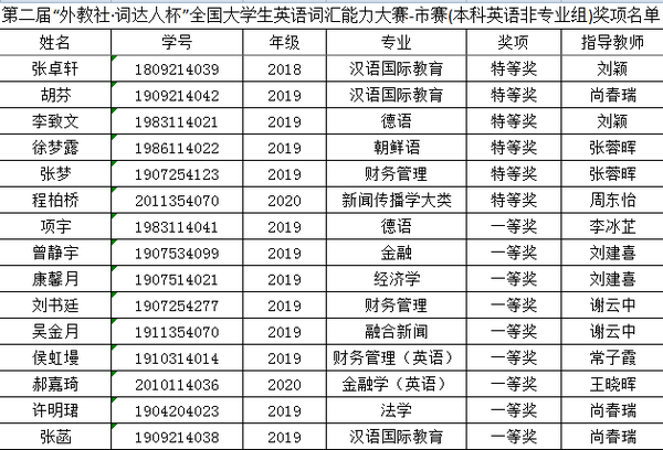 5月21日,第二届“外教社·词达人杯”全国大学生英语词汇能力大赛天津赛区比赛落下帷幕。大赛自4月10日开始,分为校赛和市赛两个阶段,设有本科非英语专业组和本科英语专业组两个组别。最终,在天津赛区决赛的云端角逐中,我校2018级学生张卓轩在本科非英语专业组中拔得头筹,斩获该组别第一名,6名学生以市赛特等奖、9名学生以市赛一等奖成绩在该组别中晋级国赛,另有11名学生获得二等奖,4名学生获得三等奖;在本科英语专业组中,2名学生获得二等奖,4名同学获得三等奖的佳绩。