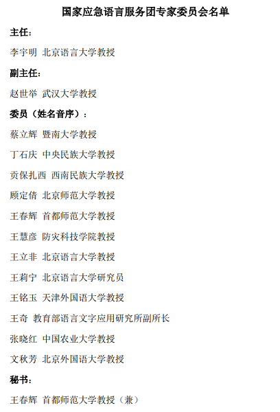 国家应急语言服务团首届专家委员会专家涵盖了语言文字、应急管理、志愿服务、信息技术等多个领域,主要职责包括为服务团开展各项工作提供专业建议,提出支撑服务团建设和应急语言服务事业发展的科研计划,参与服务团支持的科研项目立项、开题、鉴定等环节评审工作。