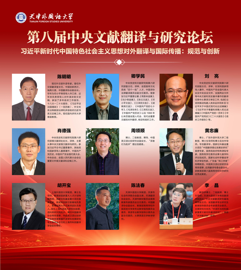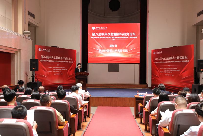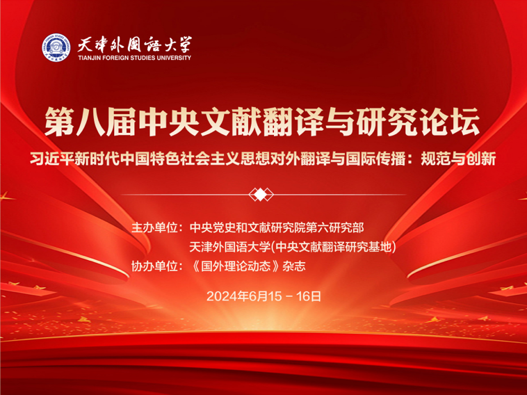 6月15日,第八届中央文献翻译与研究论坛在天津外国语大学召开。本届论坛由中央党史和文献研究院第六研究部、天津外国语大学(中央文献翻译研究基地)联合主办,《国外理论动态》杂志协办,来自中央党校、中央对外联络部、中央党史和文献研究院、外交部、新华社、中国日报社、中国外文局、中国人民大学、对外经贸大学、山东大学、中国海洋大学、上海外国语大学、广东外语外贸大学、扬州大学、天津外国语大学、大连外国语大学等三十余家机构、高校的专家学者参加开幕式。