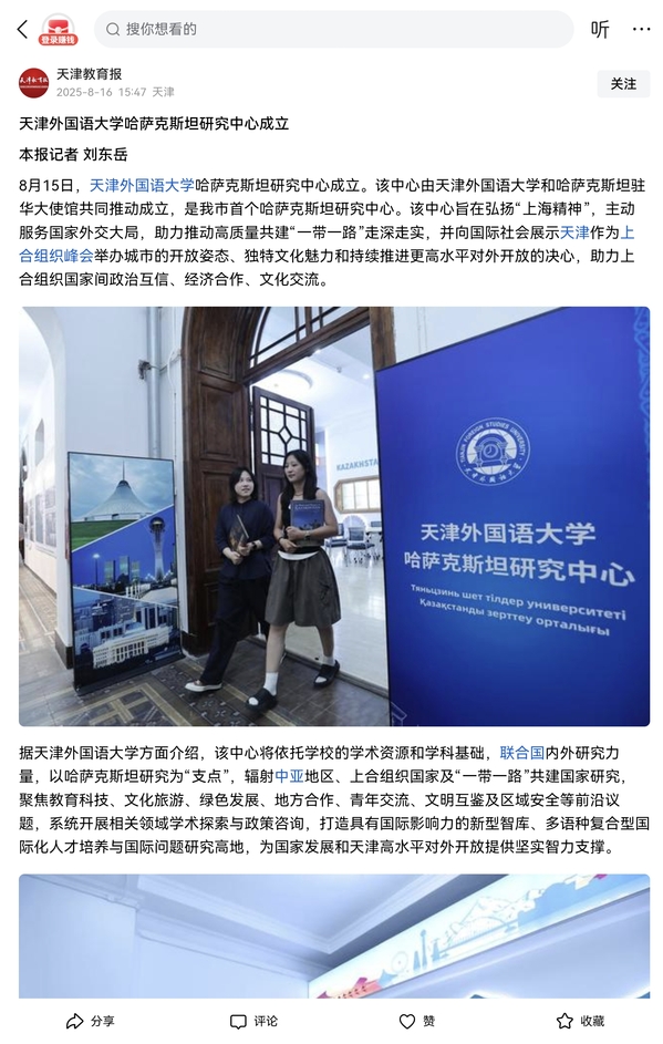 8月15日,天津外国语大学哈萨克斯坦研究中心成立。该中心由天津外国语大学和哈萨克斯坦驻华大使馆共同推动成立,是我市首个哈萨克斯坦研究中心。该中心旨在弘扬“上海精神”,主动服务国家外交大局,助力推动高质量共建“一带一路”走深走实,并向国际社会展示天津作为上合组织峰会举办城市的开放姿态、独特文化魅力和持续推进更高水平对外开放的决心,助力上合组织国家间政治互信、经济合作、文化交流。