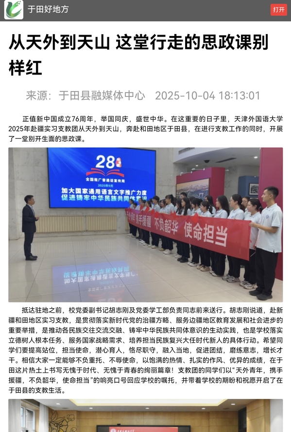 天津外国语大学2025年赴疆实习支教团在支援边疆教育的同时,也在这里学习、收获。这里既是支教团成员们为之努力奋斗的地方,又是同学们荡涤心灵,将崇高的信仰和坚定的信念融于血脉,铸入灵魂的土壤。这场别样红的思政课,将继续书写在于田支教的篇章中……