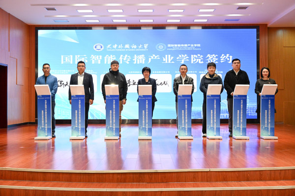 天津外国语大学校长李迎迎与天津海河传媒中心党委常委、副总裁陈国望签署合作协议,与未来电视有限公司等13家产业学院合作单位签署共建协议,并与未来电视有限公司副总经理任世武共同为“天外国际智能传播产业学院”揭牌。天津外国语大学教务处处长王济军、国际传媒学院院长马兰州分别为产业学院指导专家和行业导师颁发聘书。