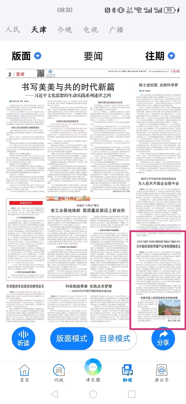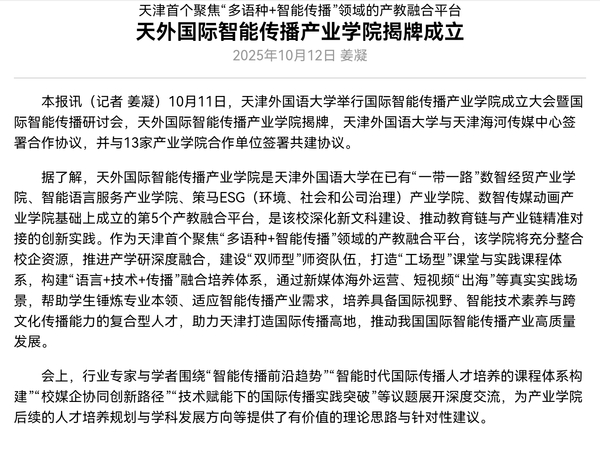 据了解,天外国际智能传播产业学院是天津外国语大学在已有“一带一路”数智经贸产业学院、智能语言服务产业学院、策马ESG(环境、社会和公司治理)产业学院、数智传媒动画产业学院基础上成立的第5个产教融合平台,是该校深化新文科建设、推动教育链与产业链精准对接的创新实践。作为天津首个聚焦“多语种+智能传播”领域的产教融合平台,该学院将充分整合校企资源,推进产学研深度融合,建设“双师型”师资队伍,打造“工场型”课堂与实践课程体系,构建“语言+技术+传播”融合培养体系,通过新媒体海外运营、短视频“出海”等真实实践场景,帮助学生锤炼专业本领、适应智能传播产业需求,培养具备国际视野、智能技术素养与跨文化传播能力的复合型人才,助力天津打造国际传播高地,推动我国国际智能传播产业高质量发展。