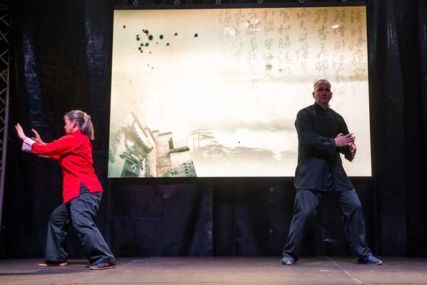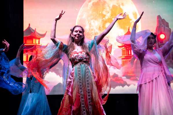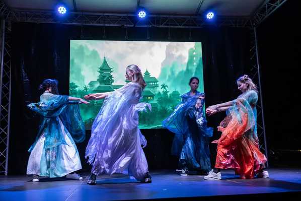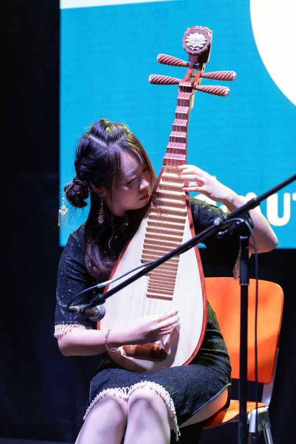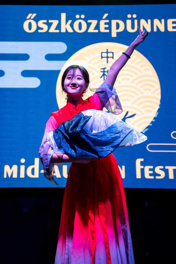 文艺表演在Dancing Fairies舞蹈队一支融合中匈风情的舞蹈中拉开序幕;随后,志愿者教师庞泓雪表演古典独舞,柔美婀娜,赢得阵阵掌声;中国留学生的琵琶演奏旋律悠远,引人入胜;歌曲独唱《水调歌头·明月几时有》,清婉动人,唤起全场共鸣;孔院学员与当地志愿者身着中国传统服饰,款款登台,衣袂飘飘,在灯光映照下尽显东方美学的典雅与韵味;其间,一段舒缓流畅的太极拳和刚猛劲健的咏春拳联袂登场,柔刚相济,别开生面。观众纷纷举起手机,记录这一曼妙时刻。