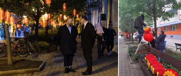 傍晚时分,巴蒂亚尼街被数百盏中国红灯笼点亮,整条街道笼罩在温暖的中国红光影之中,中秋的团圆意蕴悄然流淌。这一视觉盛宴的背后,凝聚了整个团队所有老师和中国留学生学联同学的心血和努力,德布勒森大学孔子学院匈方副院长拉兹罗·埃里克·科瓦奇先生(Mr. László Erik Kovács)和中方院长崔显军,带领团队组织华商摆摊设点、布置街道、悬挂灯笼,确保每一处细节都传递出中秋的温馨与丰足,为整场活动铺就了浓郁的中国传统文化底色。