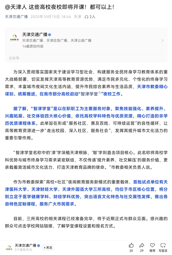 【天津交通广播】@天津人 这些高校夜校即将开课!都可以上!