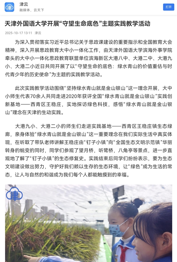 为深入贯彻落实习近平总书记关于思政课建设的重要指示和全国教育大会精神,深入开展思政教育大中小一体化工作,由天津外国语大学滨海外事学院牵头的大中小一体化思政教育联盟单位滨海新区大港八中、大港二中、大港九小、大港二小近日共同开展了以“守望生命的底色:绿水青山的价值重估与时代青少年的历史使命”为主题的实践教学活动。
