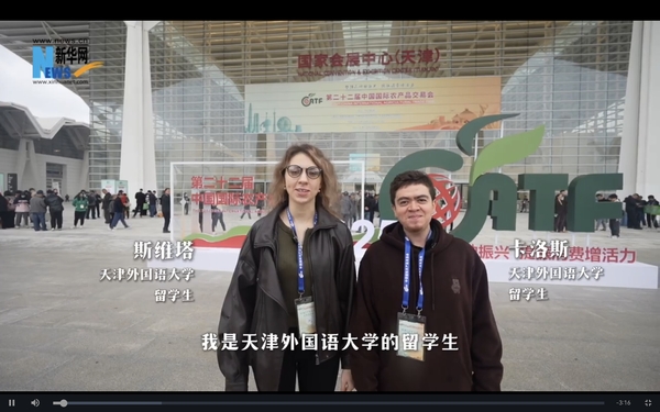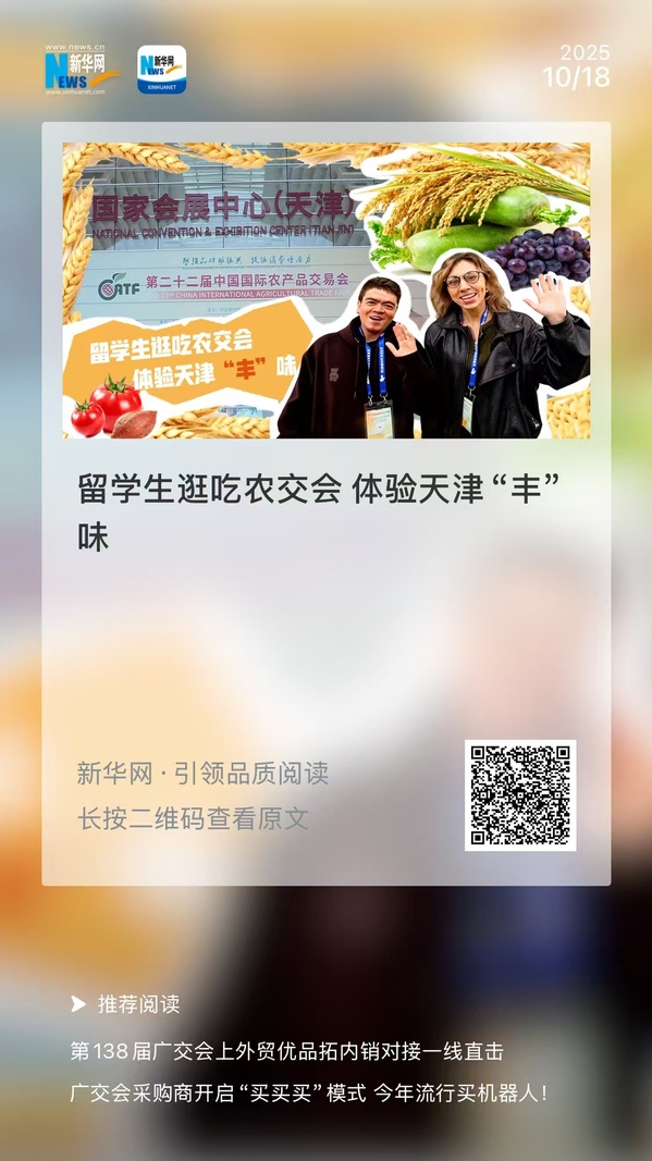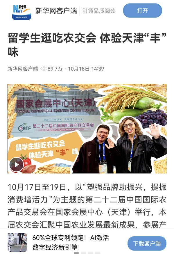 10月17日至19日,以“塑强品牌助振兴,提振消费增活力”为主题的第二十二届中国国际农产品交易会在国家会展中心(天津)举行,本届农交会汇聚中国农业发展最新成果,参展产品约2.5万种,展览面积超10万平方米。天津展区里,沙窝萝卜、小站稻、津味厨房……各式各样具备天津特色的农产品齐聚一堂,好吃又好逛。跟随来自俄罗斯和危地马拉的两位天津外国语大学留学生走进农交会现场,一站式领略中国农业的蓬勃气象,沉浸式体验天津“丰”味。