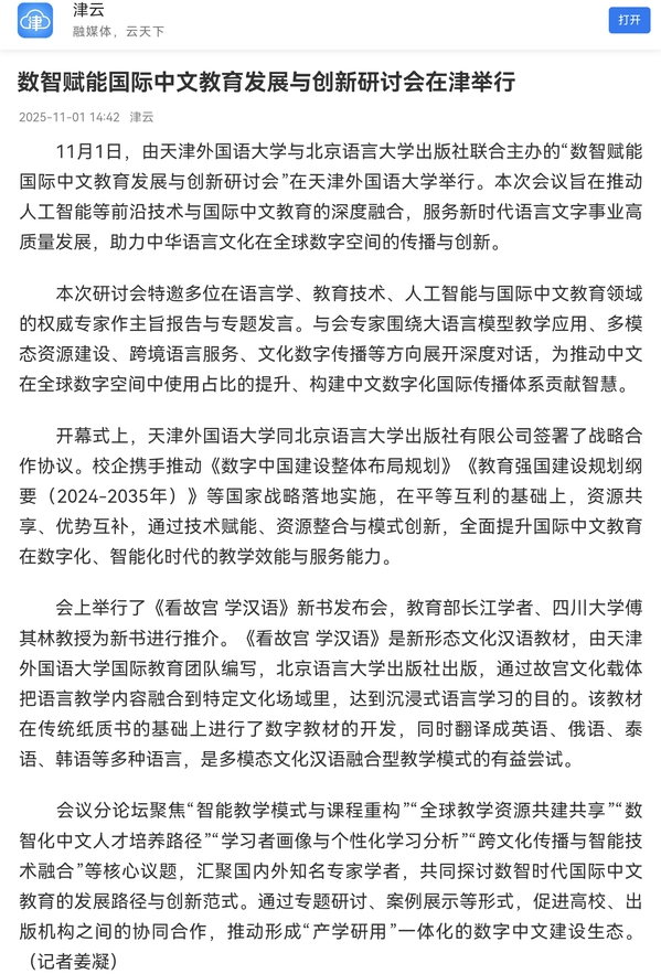 11月1日,由天津外国语大学与北京语言大学出版社联合主办的“数智赋能国际中文教育发展与创新研讨会”在天津外国语大学举行。本次会议旨在推动人工智能等前沿技术与国际中文教育的深度融合,服务新时代语言文字事业高质量发展,助力中华语言文化在全球数字空间的传播与创新。