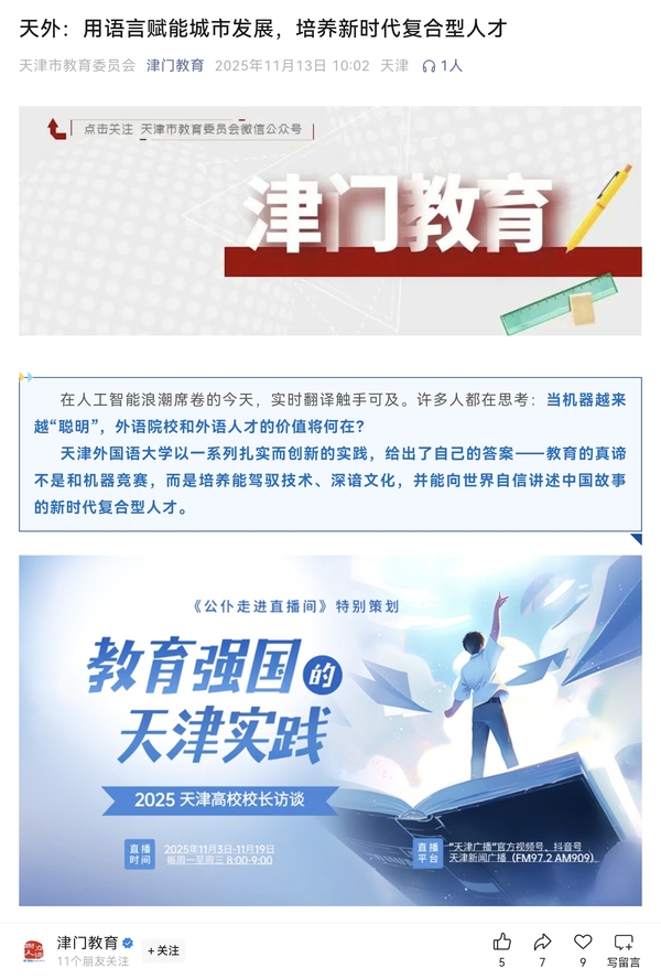 在人工智能浪潮席卷的今天,实时翻译触手可及。许多人都在思考:当机器越来越“聪明”,外语院校和外语人才的价值将何在?天津外国语大学以一系列扎实而创新的实践,给出了自己的答案——教育的真谛不是和机器竞赛,而是培养能驾驭技术、深谙文化,并能向世界自信讲述中国故事的新时代复合型人才。