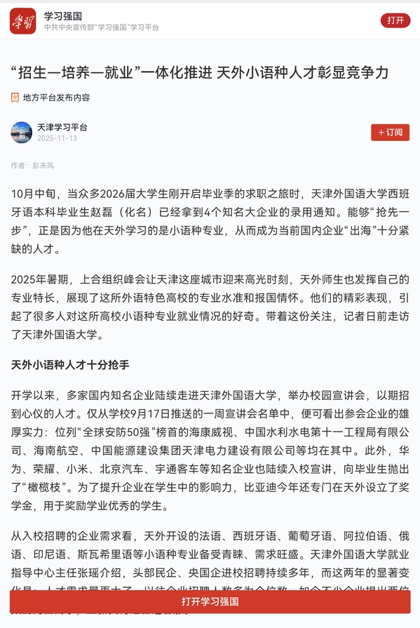 2025年暑期,上合组织峰会让天津这座城市迎来高光时刻,天外师生也发挥自己的专业特长,展现了这所外语特色高校的专业水准和报国情怀。他们的精彩表现,引起了很多人对这所高校小语种专业就业情况的好奇。带着这份关注,记者日前走访了天津外国语大学。