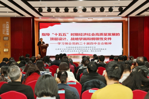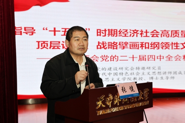 为深入学习贯彻党的二十届四中全会精神,切实把思想和行动统一到党中央的重大决策部署上来,天津外国语大学于11月20日举办干部学习大讲堂,专题学习党的二十届四中全会精神。校党委副书记胡志刚主持活动,南开大学马克思主义学院张健教授作专题辅导报告。学校全体中层干部、中青年教师代表参加学习。