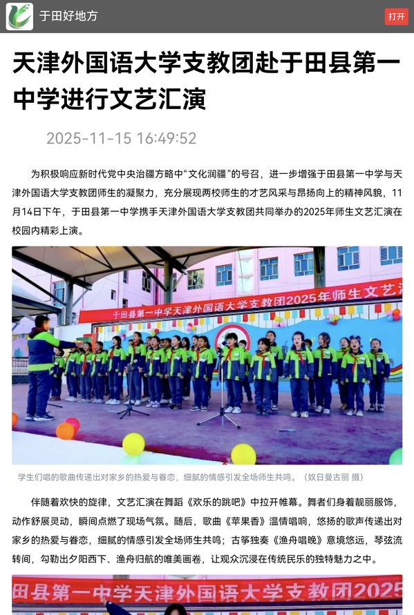 “这次活动不仅让我们欣赏到了高水平的文艺表演,也进一步增进了与天津外国语大学支教团师生的友谊。同时,我们也向天津外国语大学支教团的辛勤付出和无私奉献表示衷心的感谢。”于田县第一中学初中部语文教师李宇梦说。