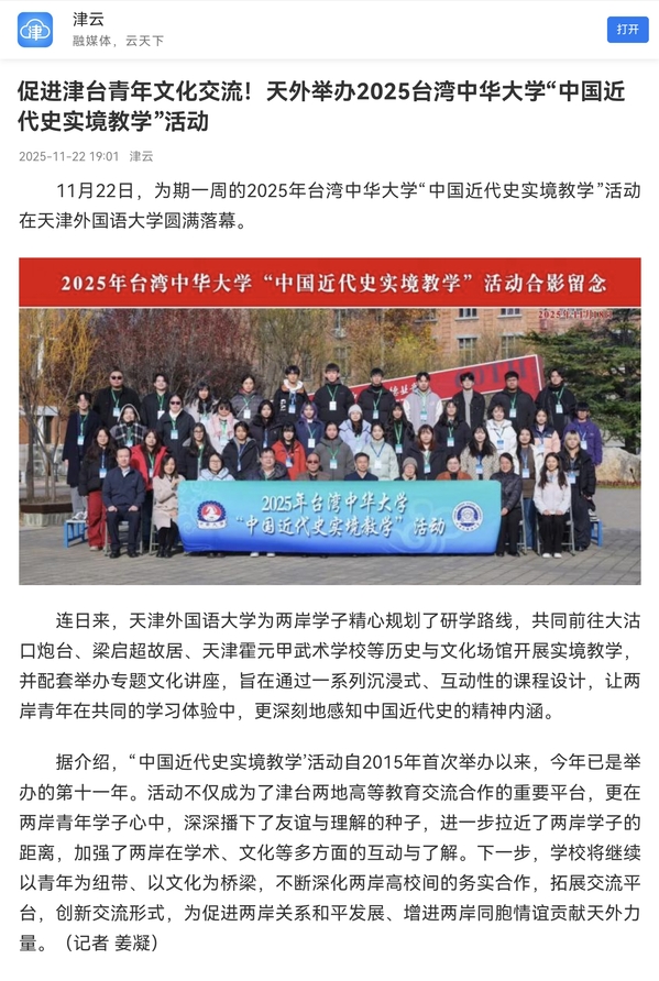 据介绍,“中国近代史实境教学’活动自2015年首次举办以来,今年已是举办的第十一年。活动不仅成为了津台两地高等教育交流合作的重要平台,更在两岸青年学子心中,深深播下了友谊与理解的种子,进一步拉近了两岸学子的距离,加强了两岸在学术、文化等多方面的互动与了解。下一步,学校将继续以青年为纽带、以文化为桥梁,不断深化两岸高校间的务实合作,拓展交流平台,创新交流形式,为促进两岸关系和平发展、增进两岸同胞情谊贡献天外力量。
