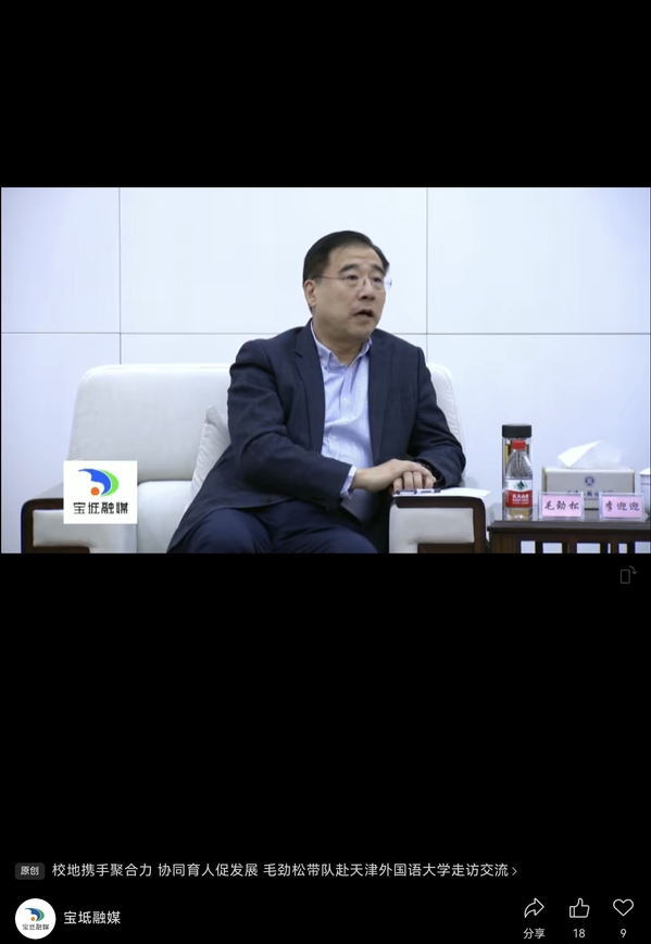 李迎迎对毛劲松一行的到来表示欢迎,并介绍了学校办学历程、学科建设及特色发展等情况。她说,宝坻文化底蕴深厚,产教融合基础扎实,发展动能充沛,开展校地合作前景广阔。天津外国语大学将充分发挥自身学科与资源优势,主动对接宝坻经济社会发展需求和办学实际,深化教育资源共建共享与人才联合培养,拓展合作维度、丰富合作内涵,推动校地优势互补、互利共赢。