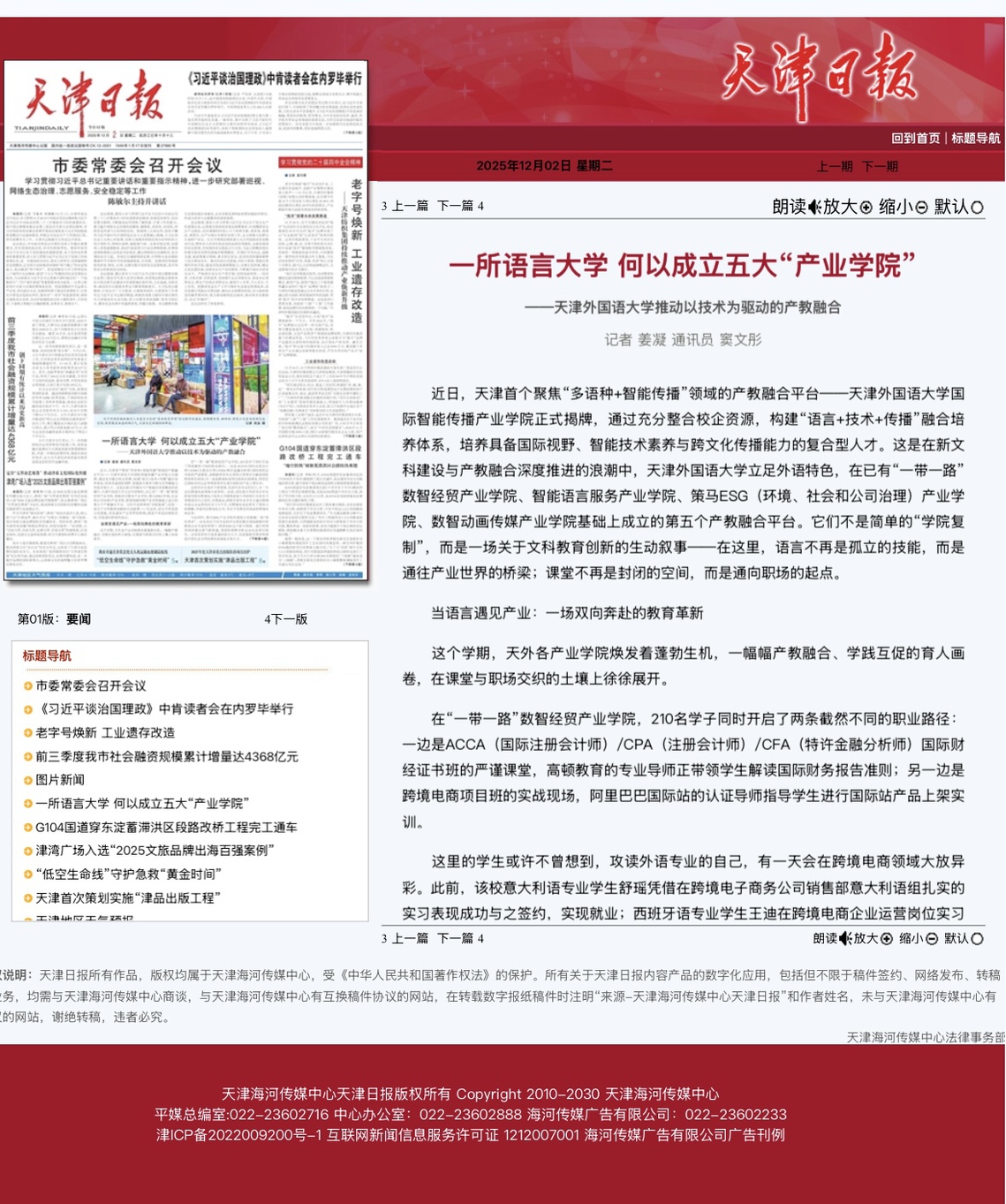 近日,天津首个聚焦“多语种+智能传播”领域的产教融合平台——天津外国语大学国际智能传播产业学院正式揭牌,通过充分整合校企资源,构建“语言+技术+传播”融合培养体系,培养具备国际视野、智能技术素养与跨文化传播能力的复合型人才。这是在新文科建设与产教融合深度推进的浪潮中,天津外国语大学立足外语特色,在已有“一带一路”数智经贸产业学院、智能语言服务产业学院、策马ESG(环境、社会和公司治理)产业学院、数智动画传媒产业学院基础上成立的第五个产教融合平台。它们不是简单的“学院复制”,而是一场关于文科教育创新的生动叙事——在这里,语言不再是孤立的技能,而是通往产业世界的桥梁;课堂不再是封闭的空间,而是通向职场的起点。