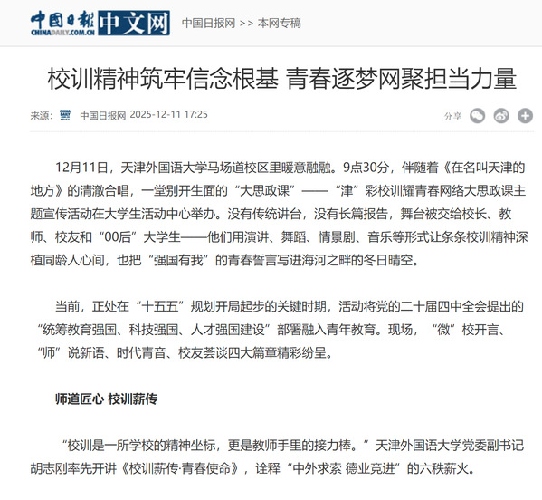 12月11日,天津外国语大学马场道校区里暖意融融。9点30分,伴随着《在名叫天津的地方》的清澈合唱,一堂别开生面的“大思政课”——“津”彩校训耀青春网络大思政课主题宣传活动在大学生活动中心举办。没有传统讲台,没有长篇报告,舞台被交给校长、教师、校友和“00后”大学生——他们用演讲、舞蹈、情景剧、音乐等形式让条条校训精神深植同龄人心间,也把“强国有我”的青春誓言写进海河之畔的冬日晴空。