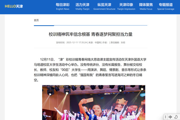 12月11日,“津”彩校训耀青春网络大思政课主题宣传活动在天津外国语大学马场道校区大学生活动中心举办。没有传统讲台,没有长篇报告,舞台被交给校长、教师、校友和“00后”大学生——用演讲、舞蹈、情景剧、音乐等形式让条条校训精神深植同龄人心间,也把“强国有我”的青春誓言写进海河之畔的冬日晴空。