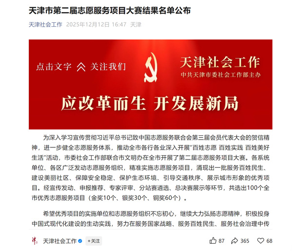 希望优秀项目的实施单位和志愿服务组织不忘初心,继续大力弘扬志愿精神,积极投身中国式现代化建设的生动实践,努力在服务国家战略、服务百姓民生、服务社会治理中传递真善美,传播正能量,擦亮志愿服务品牌,更好服务天津高质量发展。