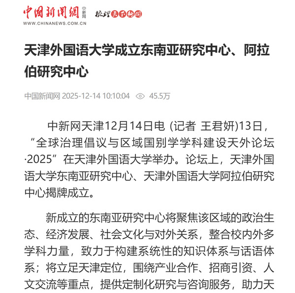 中新网天津12月14日电 (记者 王君妍)13日,“全球治理倡议与区域国别学学科建设天外论坛·2025”在天津外国语大学举办。论坛上,天津外国语大学东南亚研究中心、天津外国语大学阿拉伯研究中心揭牌成立。