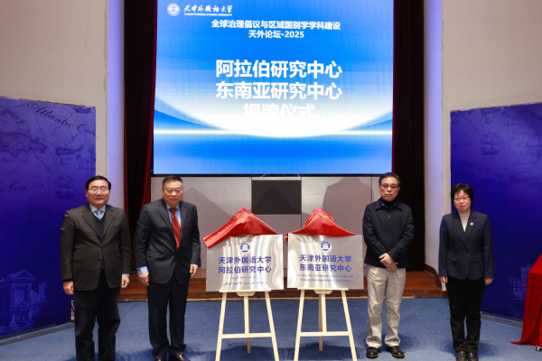 原中共中央对外联络部副部长、原中国驻朝鲜特命全权大使李进军,中国现代国际关系研究院前院长陆忠伟,天津外国语大学校长李迎迎等共同为阿拉伯研究中心、东南亚研究中心揭牌。天津外国语大学阿拉伯研究中心成立后,将紧扣国家战略与区域发展需求,以学科交叉为纽带、科研创新为核心、社会服务为导向,着力打造集科学研究、人才培养、咨政服务、文化交流于一体的高水平平台,构建“阿拉伯语+多学科”交叉研究体系,推动学校阿拉伯语学科向复合型发展转型升级,提升学术竞争力与行业影响力;东南亚研究中心成立后,将坚持“立足天津、服务全国、面向东南亚”定位,以学科交叉为支撑,提升科研创新与社会服务能力,逐步建成集科学研究、建言资政、人才培养、学术交流于一体的特色智库以及国内有影响力的东南亚区域研究基地,为助力国家战略实施、助推区域经济高质量发展贡献高校智慧。