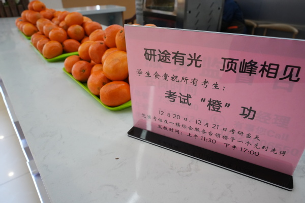 为助力研考学生从容应考,天外推出暖心服务,食堂精心准备新鲜的橙子,免费赠予考生,祝愿每一位奋斗的学子心想事“橙”、“橙”功上岸;提供免费的竹蔗茅根雪梨茶、大麦茶、热水,并设置专门的考研休息区,为考生提供一个安静、舒适的休憩场所。21日冬至到来,食堂免费赠送水饺,以温暖的方式祝福考研学子考试顺利。