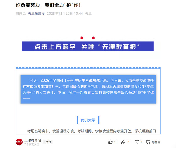 今天,2026年全国硕士研究生招生考试初试启幕。连日来,我市各高校通过多种方式为考生加油打气,营造出暖心的助考氛围,展现出天津高校的温度和“以学生为中心”的人文关怀。下面,我们一起看看天津各高校有哪些暖心举动“戳”中了你——