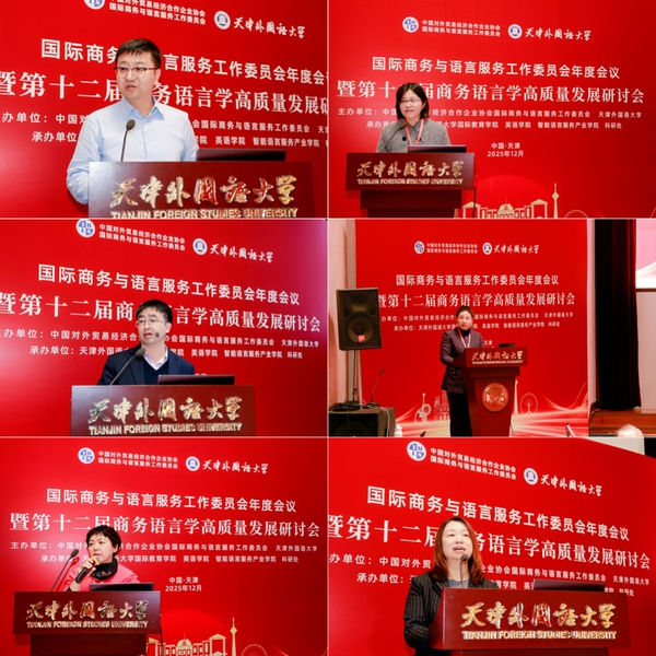 12月19日至21日,由中国对外经济贸易合作企业协会国际商务与语言服务工作委员会与天津外国语大学联合主办的“2025国际商务与语言服务工作委员会年度会议暨第十二届商务语言学高质量发展研讨会”在天津外国语大学成功举行。中国人民大学、北京外国语大学、北京语言大学、对外经济贸易大学、南京师范大学、上海对外经贸大学、四川外国语大学、西安外国语大学等全国87所高校的180多名专家学者、骨干教师及企业代表参会。