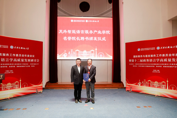 开幕式上举行了聘任与颁奖仪式。朱鹏霄为北京语言大学王立非教授颁发天津外国语大学智能语言服务产业学院名誉院长聘书。
