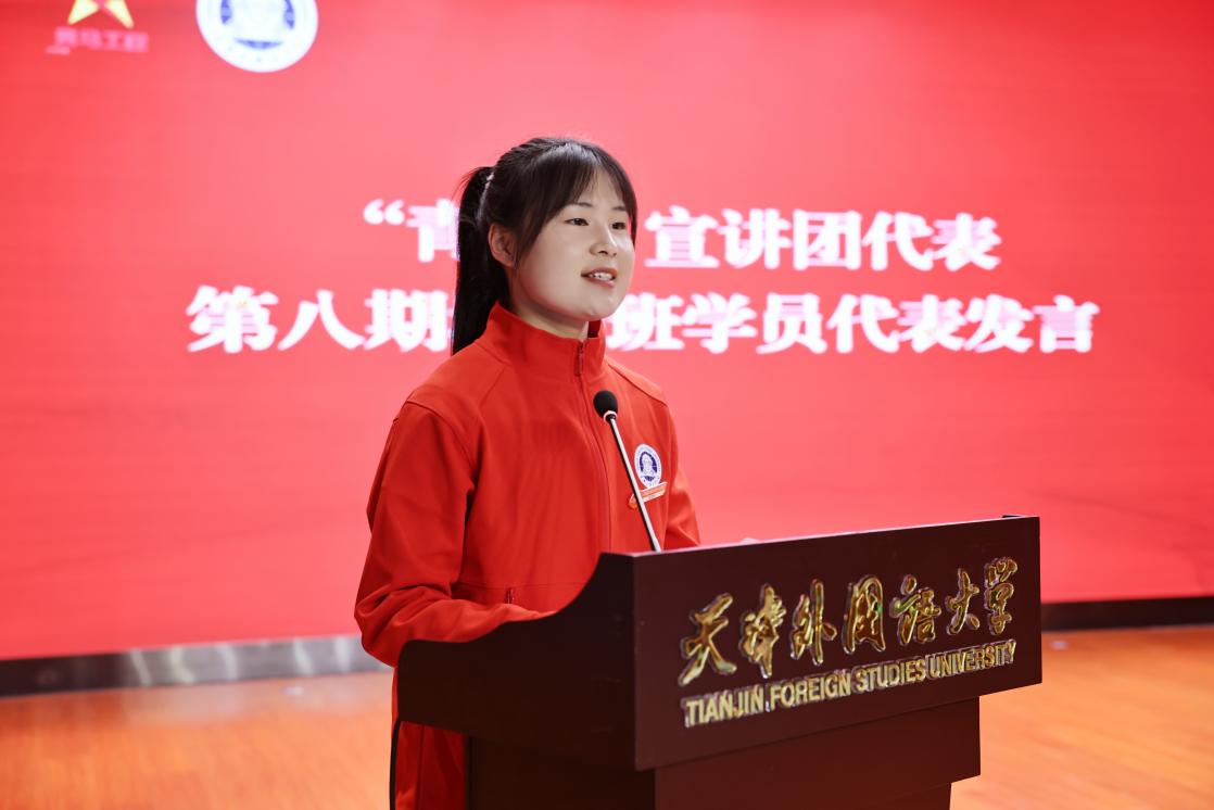 青语宣讲团、第八期青马培训班学员代表郭育铷同学发言,分享了她从本科到研究生对青马工程不变的深情和坚定。