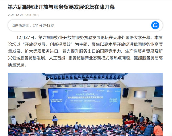 12月27日,第六届服务业开放与服务贸易发展论坛在天津外国语大学开幕。本届论坛以“开放促发展,创新提质效”为主题,聚焦以高水平开放促进我国服务业高质量发展、扩大优质服务进口、着力提升服务出口的国际竞争力、生产性服务贸易及新兴领域服务贸易发展、人工智能+服务贸易新业态新模式等热点问题,赋能服务贸易高质量发展。