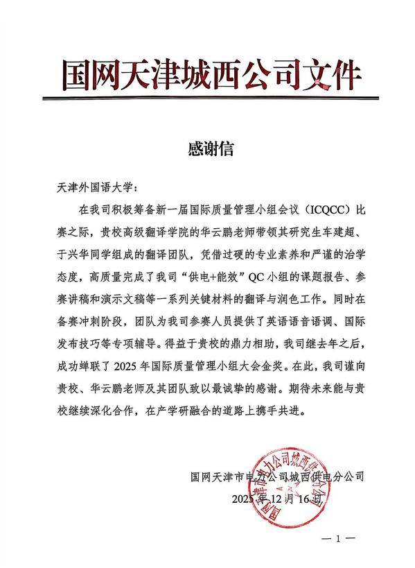 近日,天津外国语大学高级翻译学院先后收到国网天津市电力公司城南供电分公司、城西供电分公司发来的感谢信,对高翻学院师生团队助力企业在2025年国际质量管理小组会议(ICQCC)中连续斩获金奖表示诚挚感谢。这一成果,既是学校发挥语言服务优势、主动服务社会的生动体现,也是深化产教融合、以真实项目锻造高水平翻译人才的重要实践。