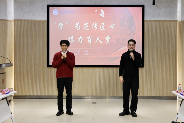 辅导员代表发言环节中,8位年轻辅导员分为4组依次分享自己在“比学赶超”过程中的心路历程、实践感悟与育人智慧。“比”技艺育英才,共筑卓越梦。第三届全国大学生职业规划大赛课程教学赛道天津市银奖获得者马雨宁和天津市大学生年度人物指导教师吴欣洁在不同的赛场展现出同样的精彩,对专业技能精益求精,在育人本领上精雕细琢,“比”出了天外辅导员的职业高度。“学”为范传匠心,接力育人梦。“英七七级校友校长特奖”优秀员工马鑫和天津市第九期“青马工程”高校班入选者石举杰以幽默诙谐的风格讲述了在各自岗位上潜心学习取得的斐然成绩,诠释了以“学”促成长、以“干”创佳绩的奋斗故事。“赶”星光赴远方,奉献西部梦。2025年援疆支教团带队教师张钰和新入职辅导员代表乔乐天用别开生面的对话形式带领现场观众走进点亮远方的星光,“赶”向育人初心的奔赴,将个人理想融入时代浪潮的追逐。“超”既往越新篇,擘画未来梦。首届天津市高校军事理论课教学大赛二等奖获得者李爽和天津市基层理论宣讲员风采展示活动三等奖获得者赵行在“超越”中突破认知壁垒、拓展能力边界、创新育人模式,不断在挖掘自身潜力中丰富实践。大家的精彩发言展现了学校学工队伍勤研善悟、求真力行的精神风貌。